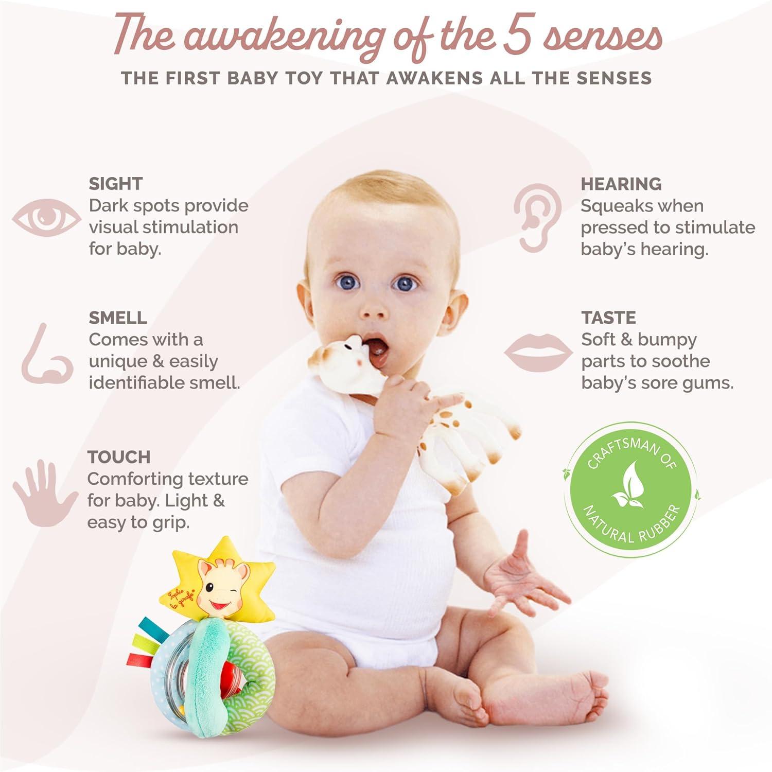 SENSORY: Sophie has dark contrasting spots and a flexible, soft, lightweight body with many parts to chew (ears, horns, legs). She's also equipped with a unique whistle when squeezed. The plush rattle is filled with beads and has easy-to-grip handles. Jingle the beads to entertain baby!