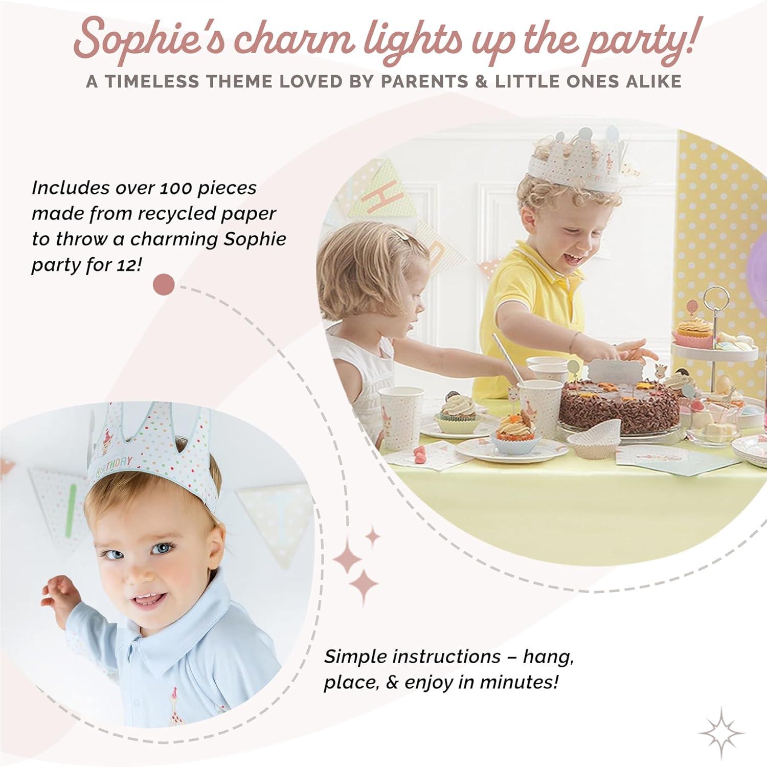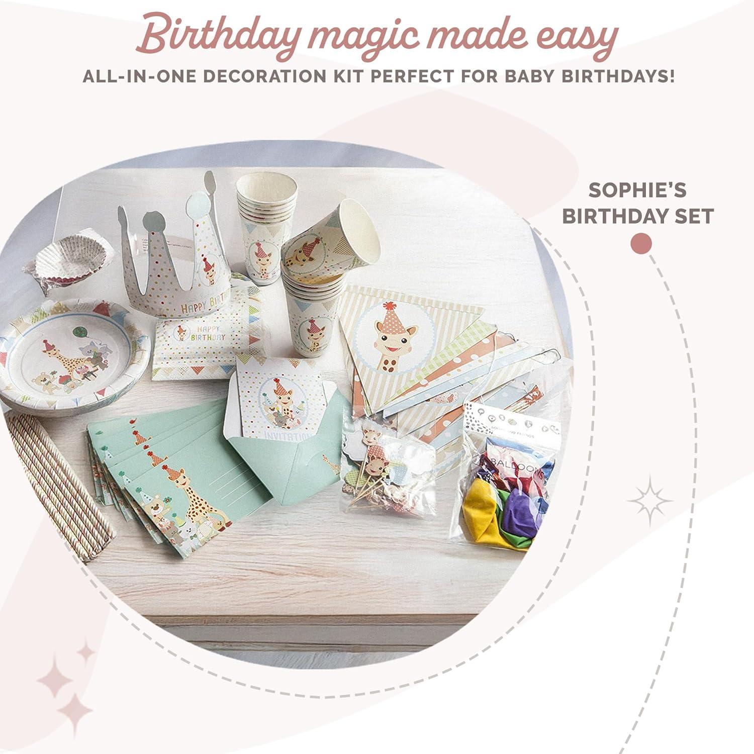 Sophie la girafe My Birthday with Sophie|Kids Birthday Decorations Party Supplies For 12 | Plates, Cups, Napkins, Utensils, Invitations, Banner, Balloons, Cake/Cupcake Toppers, Crown | 110 Piece Kit