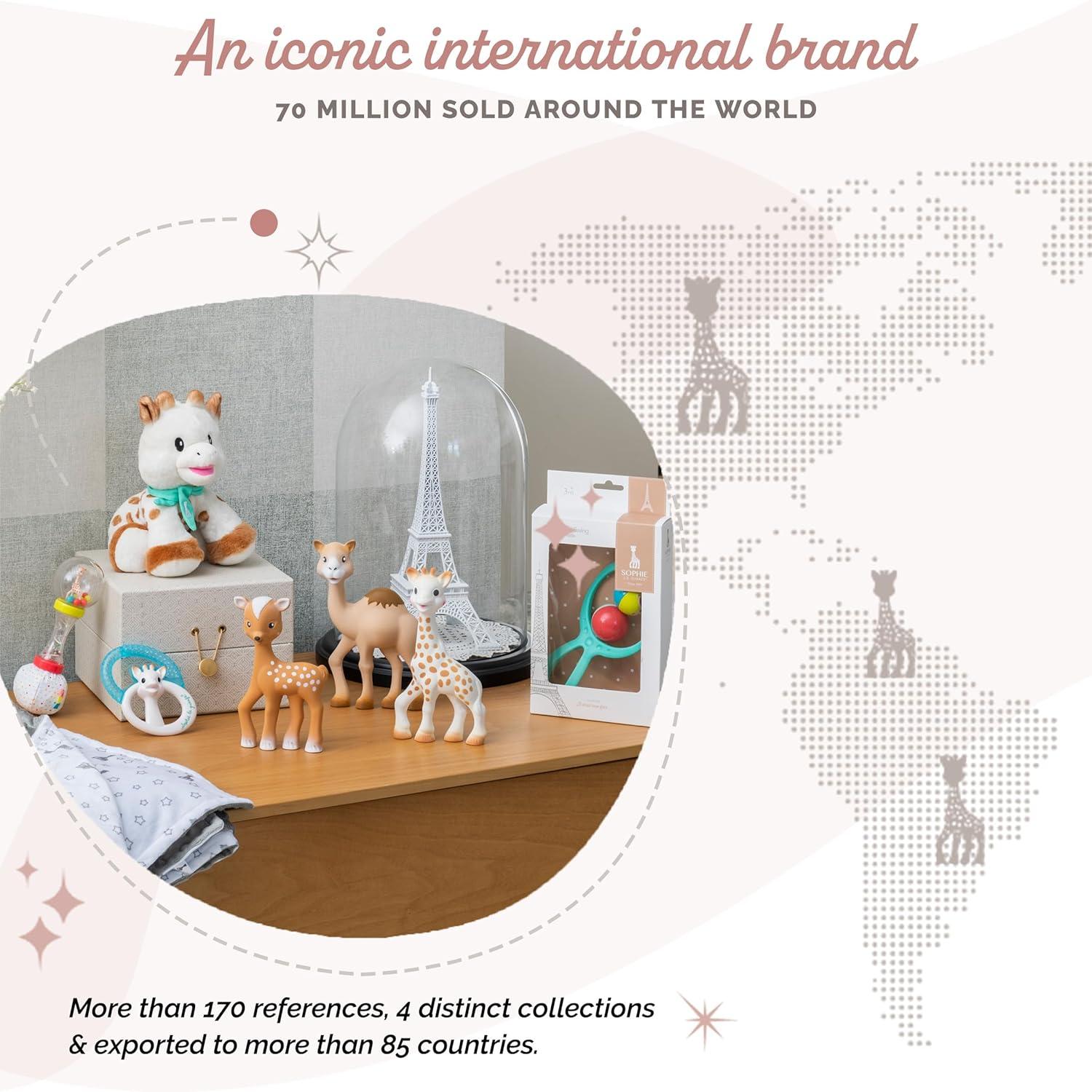 HISTORY: On May 25, 1961, the day of Saint Sophia, in the heart of Paris, a unique toy imagined by Mr. Rampeau was manufactured for the first time. This beloved toy measures 18 centimeters, has 76 dark spots, and emits a mischievous and now legendary “pouet.” Its name? Sophie, of course! Since its creation, over 70 million copies of Sophie la girafe have been sold worldwide.