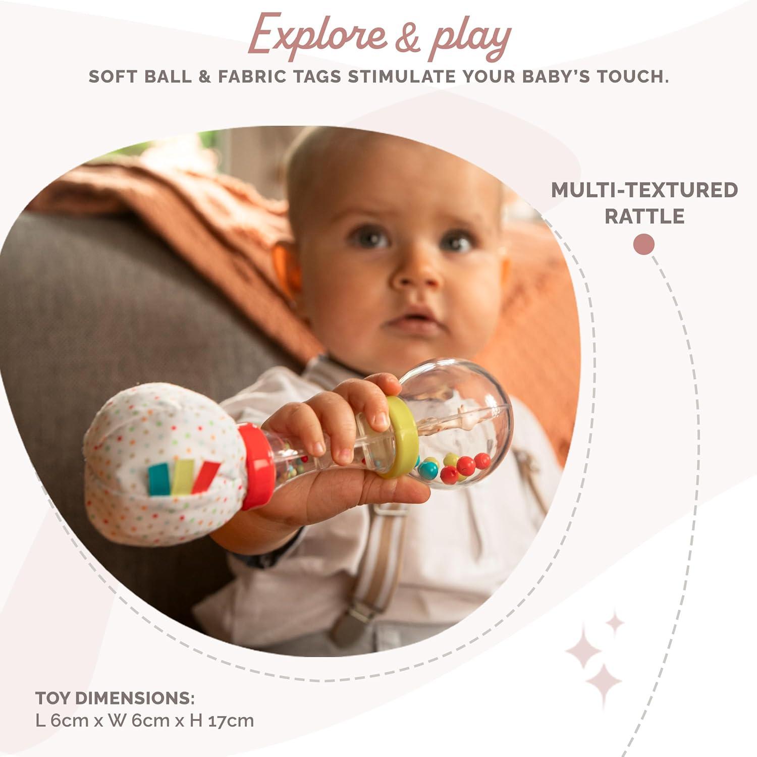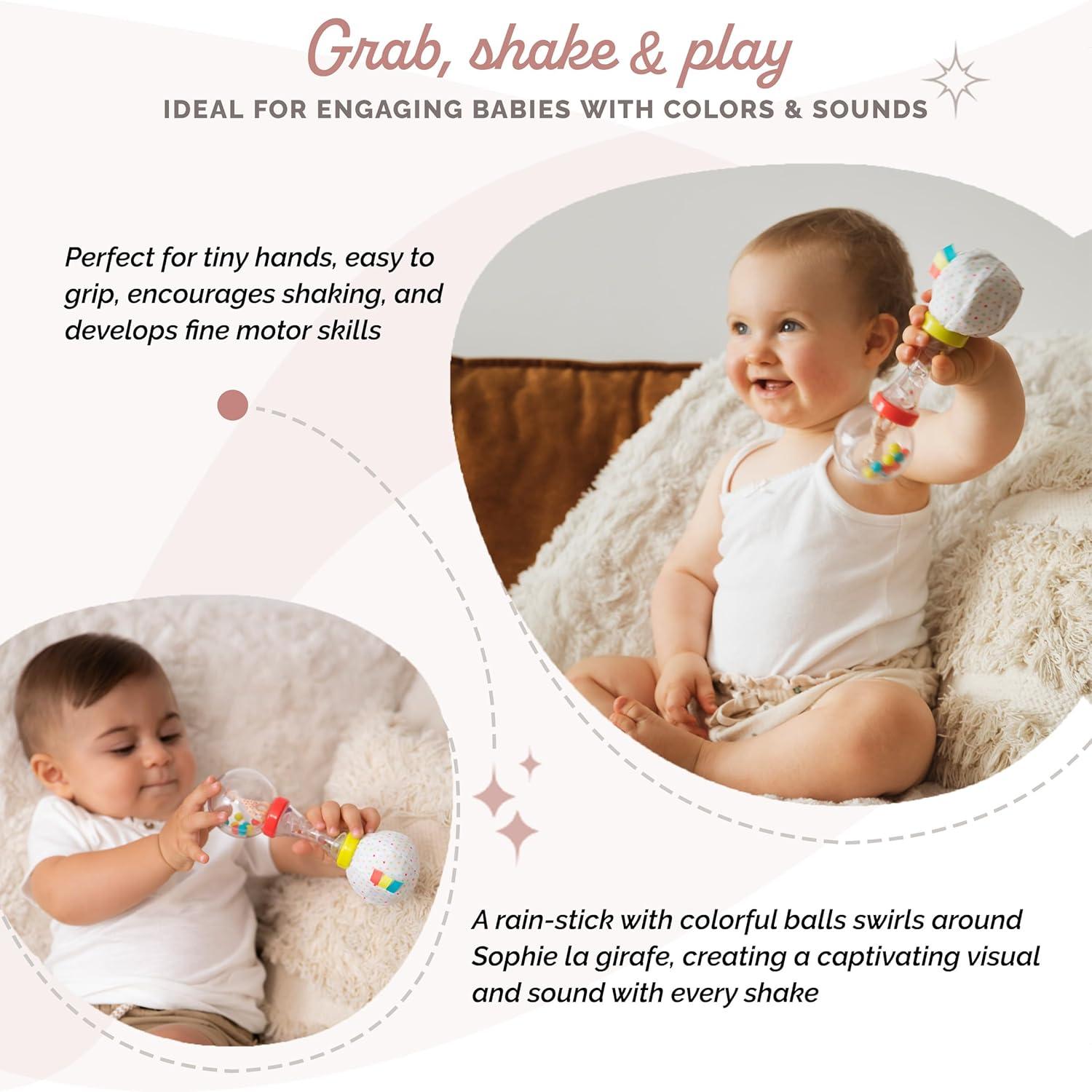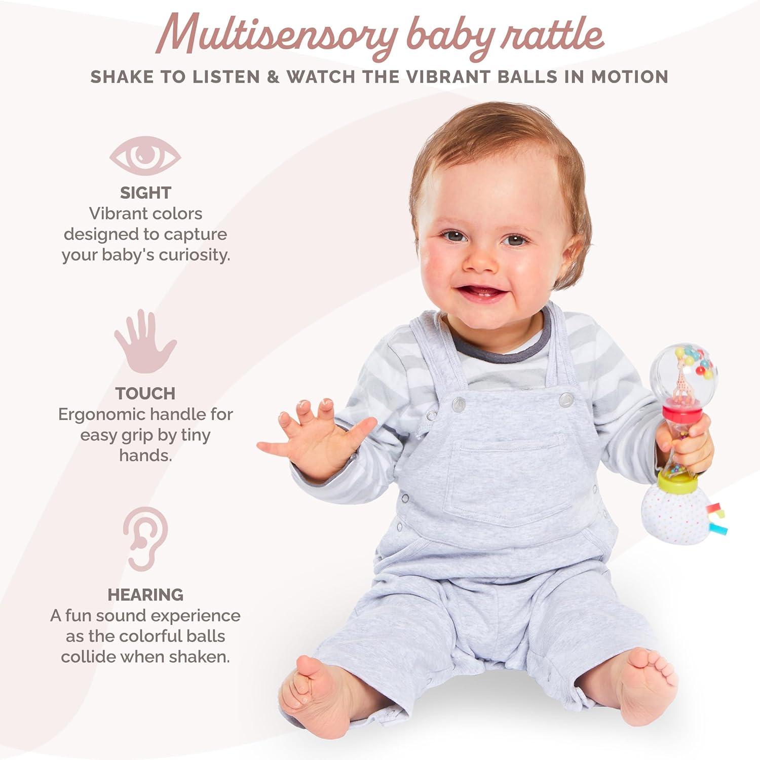 SENSORY: This rattle has Sophie la girafe inside, colored balls to shake, and a soft fabric end with textured tabs and a crinkling sound to stimulate baby's sense of sound.
